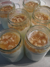 Entretanto moa grosseiramente o amendoim num almofariz e junte o mel. Distribua por cima de cada um dos iogurtes. Depois de fermentados (cerca de 10 horas). Leve ao frigorifico.