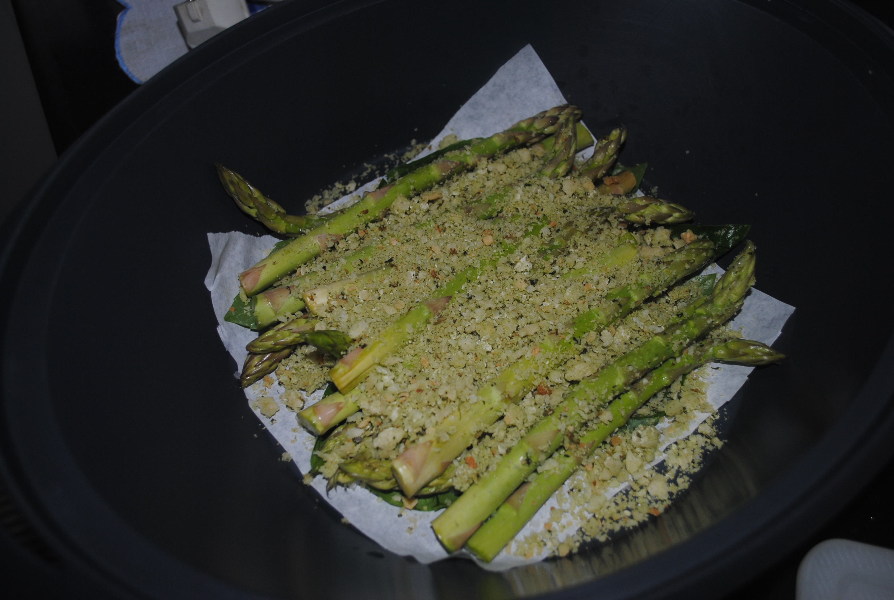 Dica: Eu fiz os espargos enquanto cozinhava no copo um arroz de cenoura.