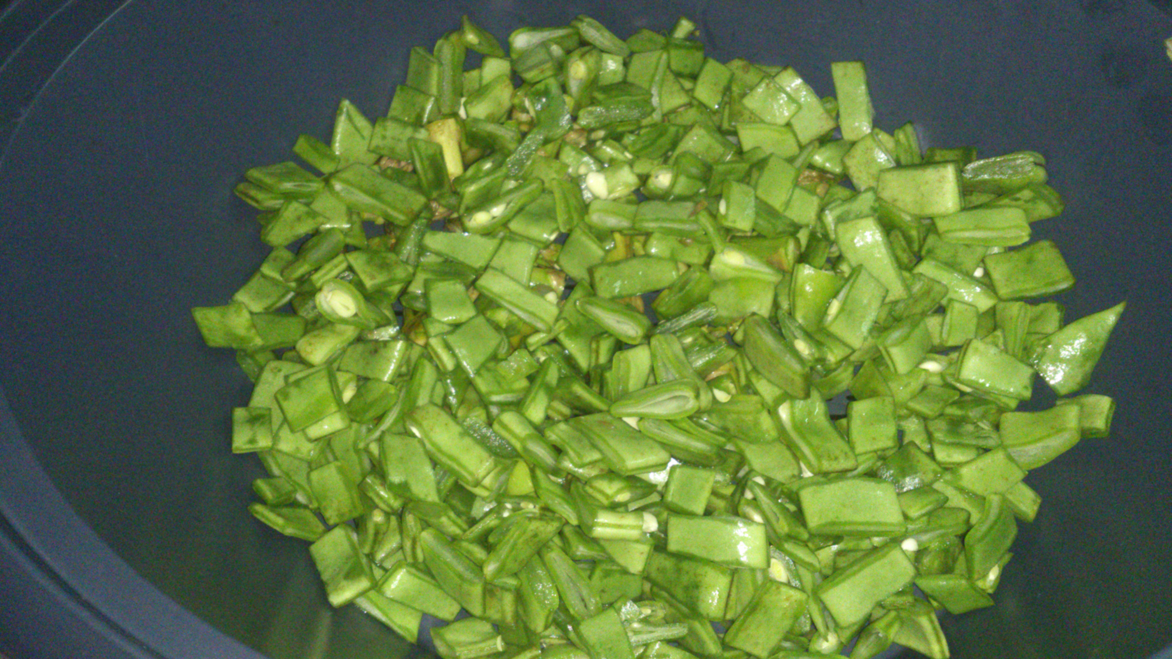 "Colher de pau" .Juntar o feijão verde cozido e os ovos batidos.