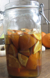 2 - Coloca-se as laranjas num frasco vedante e junta-se o aguardente. Agita-se bem de modo às laranjas ficarem submersas no aguardente. Guarda-se em sitio escuro e fresco durante 2 semanas.