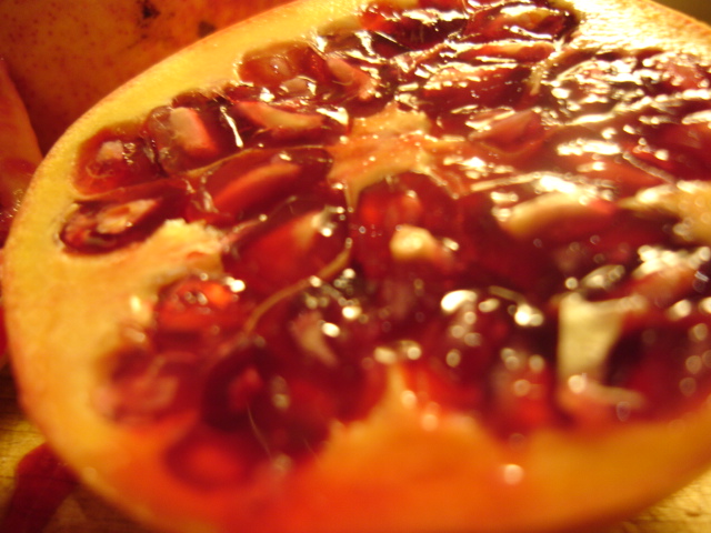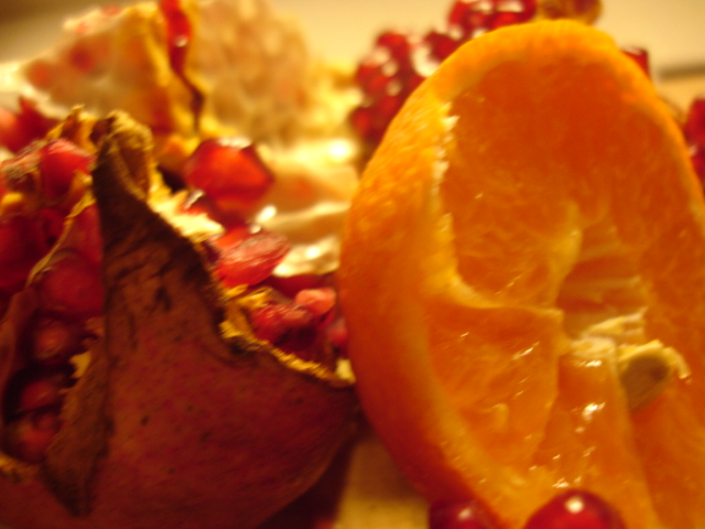 - Colocar as tangerinas no copo. (Fica mais ácido com casca), as romãs, a lima partida ao meio e o açúcar.Adicionar a água, ( se quiser que fique mais liquido, adicione mais água).