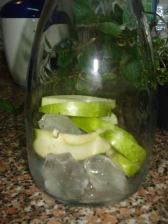 Junte alguns cubos de gelo e as fatias de maçã com casca.