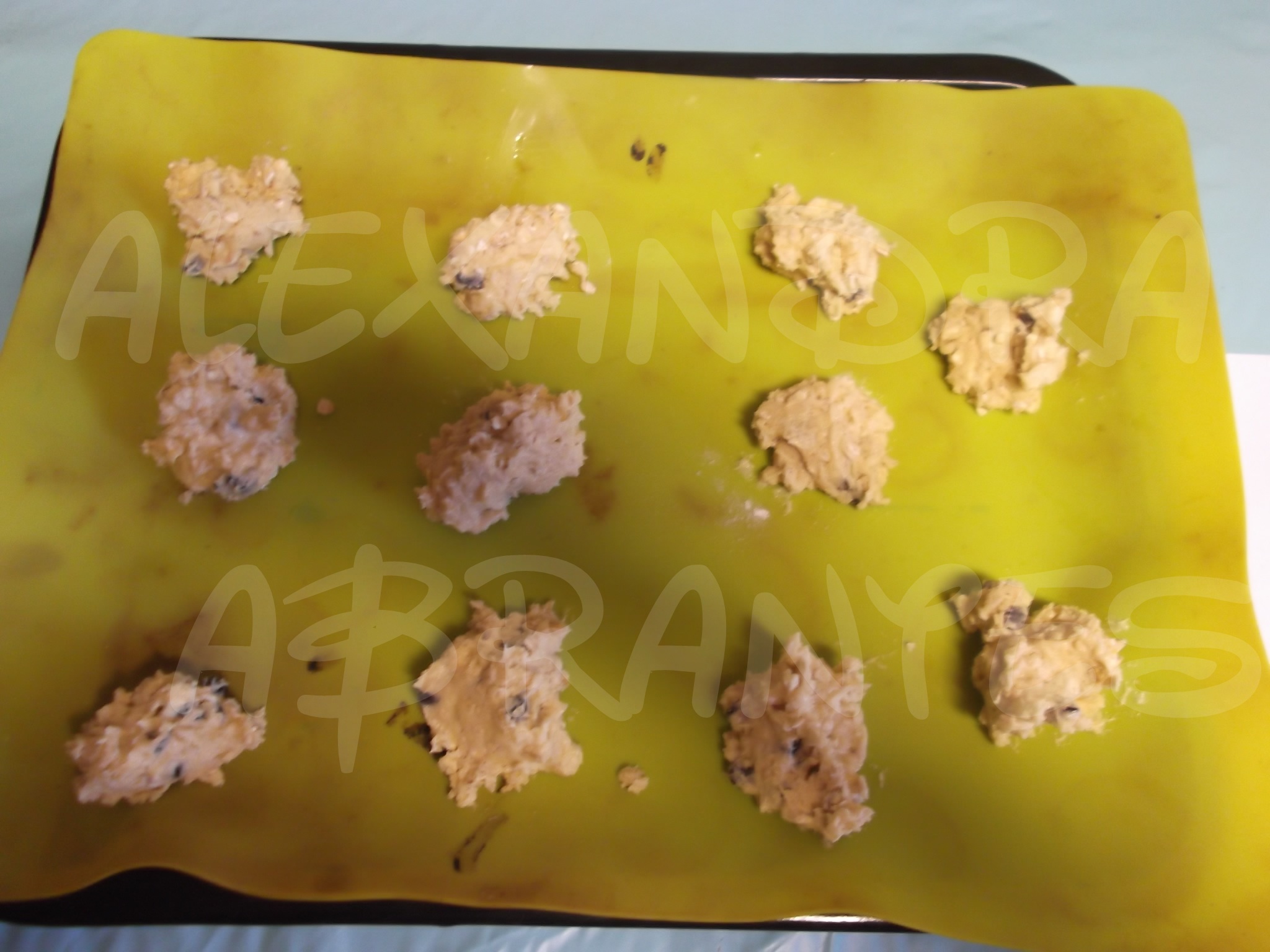 Num tabuleiro forrado com papel vegetal ou com um tapete de silicone, deita-se pequenas colheradas da massa, espaçadas entre elas e sem ser necessário espalmá-las.