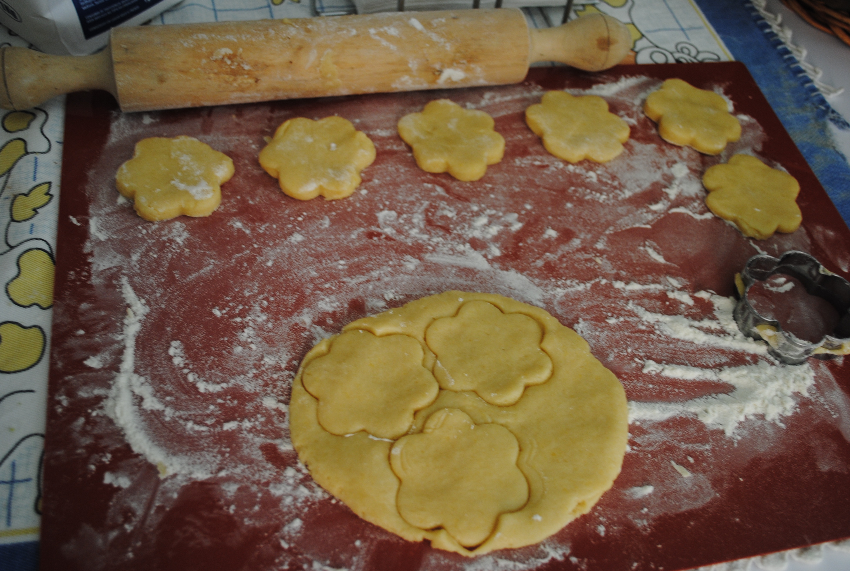 Numa superfície com farinha colocar porções de massa que se espalmão com a mão ficando com 1/2 cm de espessura e cortar as bolachas com a forma pretendida.