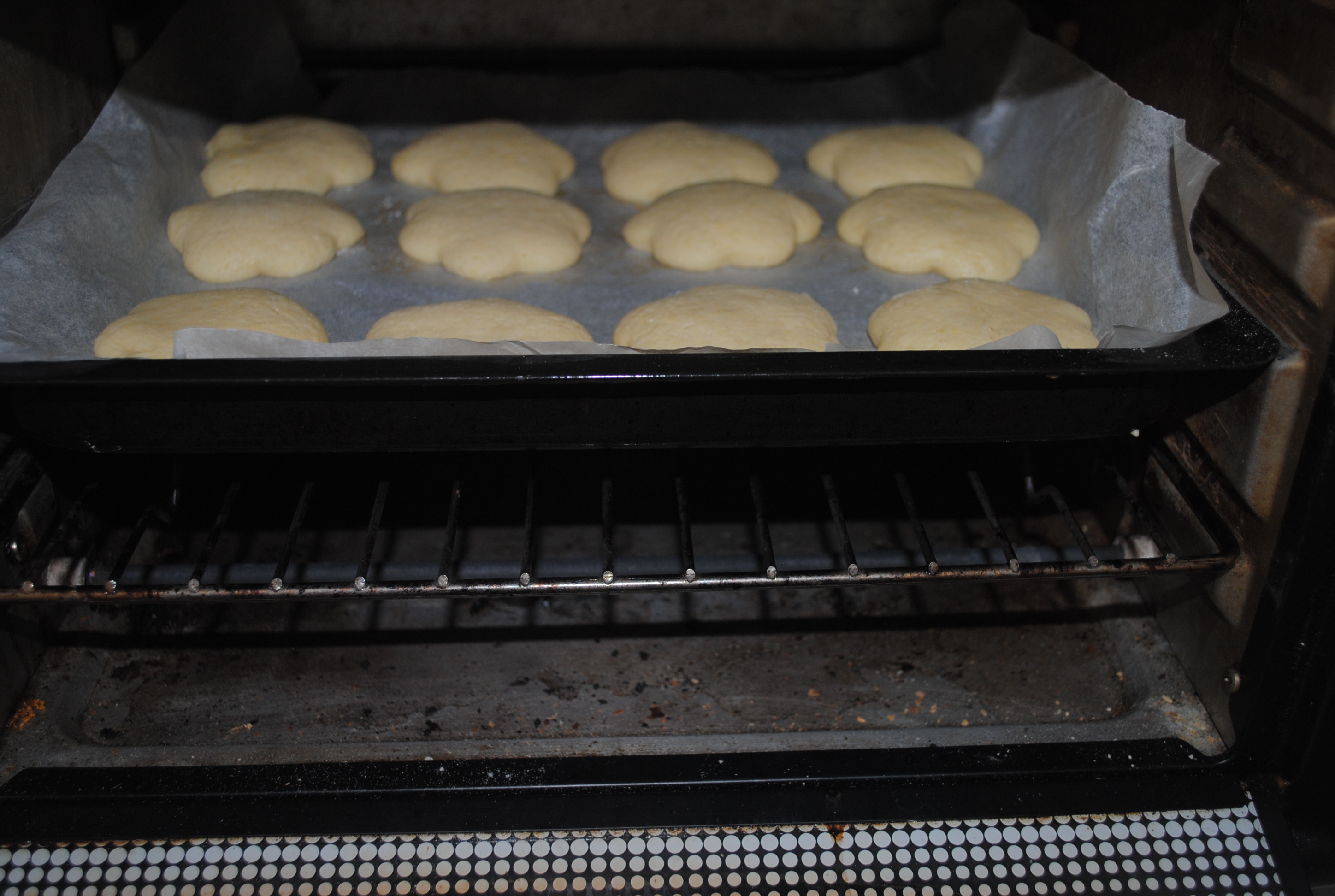Colocar as bolachas num tabuleiro forrado com papel vegetal e cozem em forno pré aquecido a 200.º cerca de 15 m.