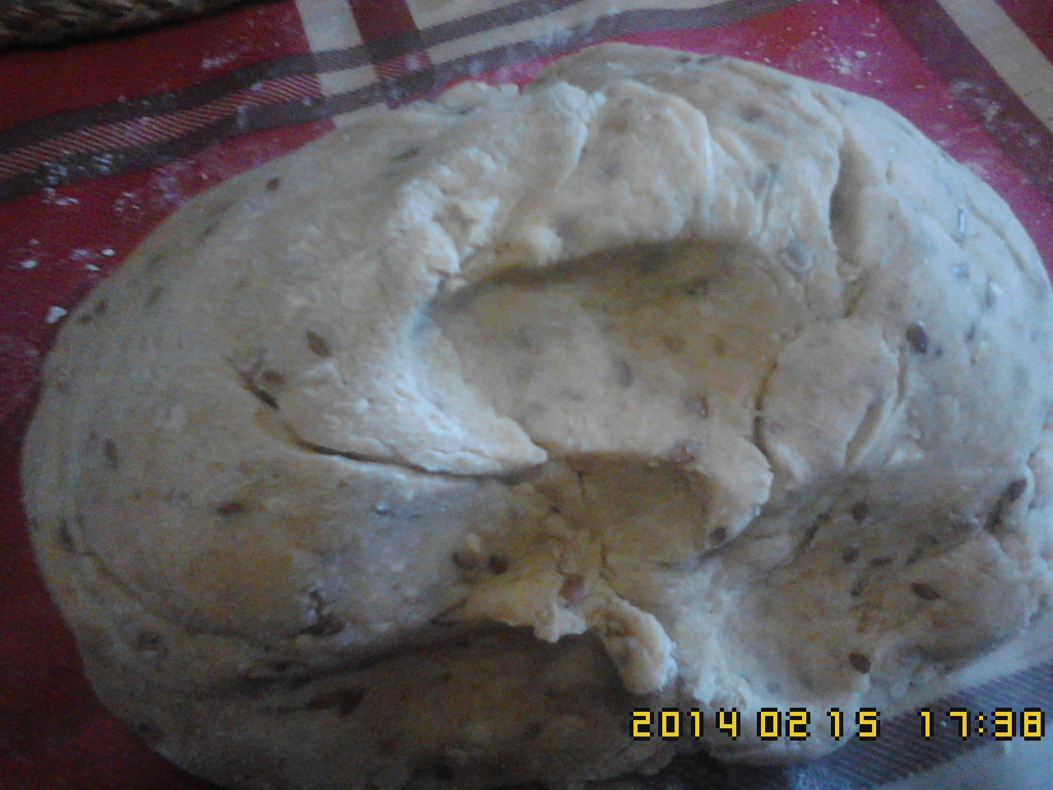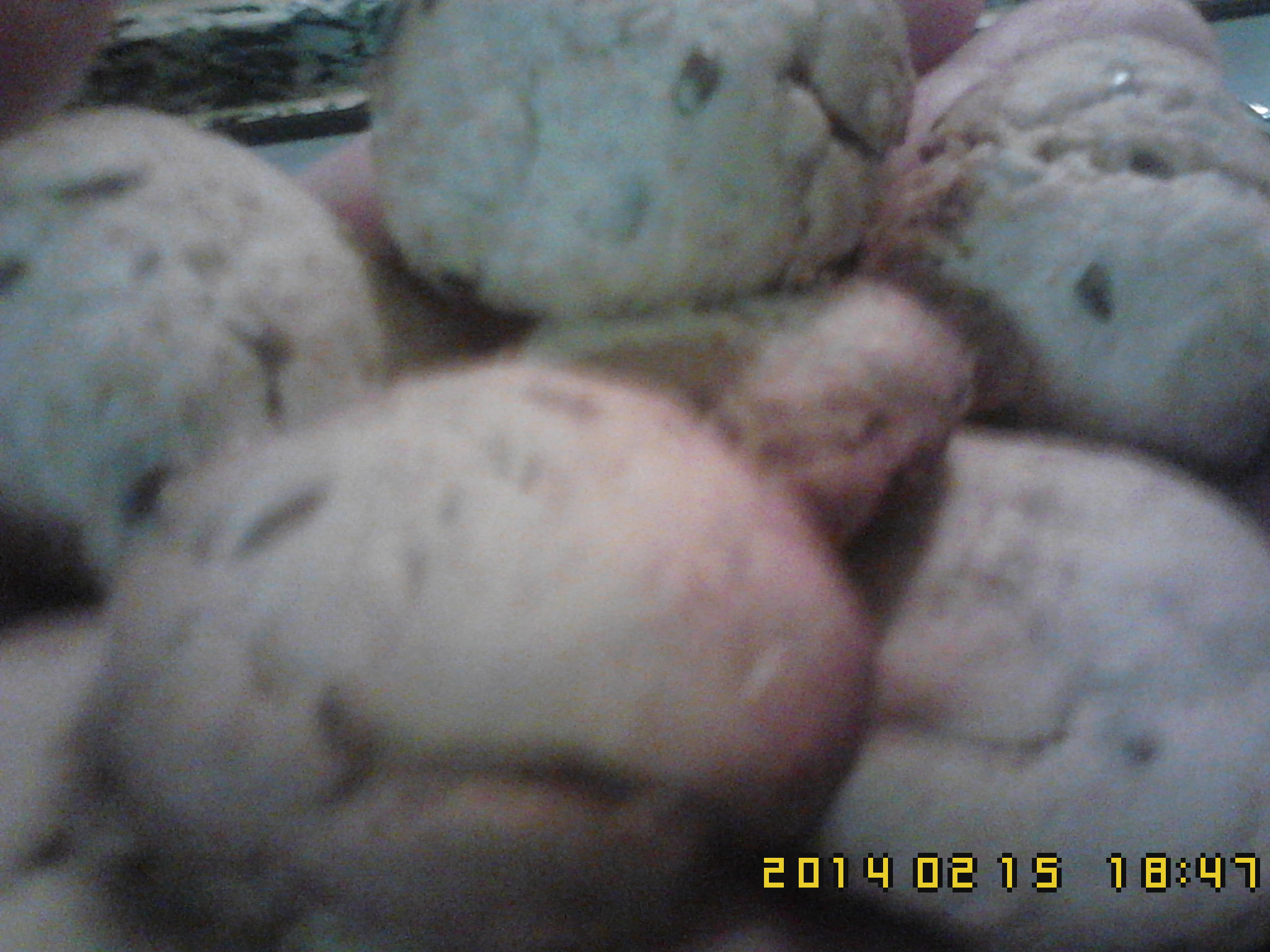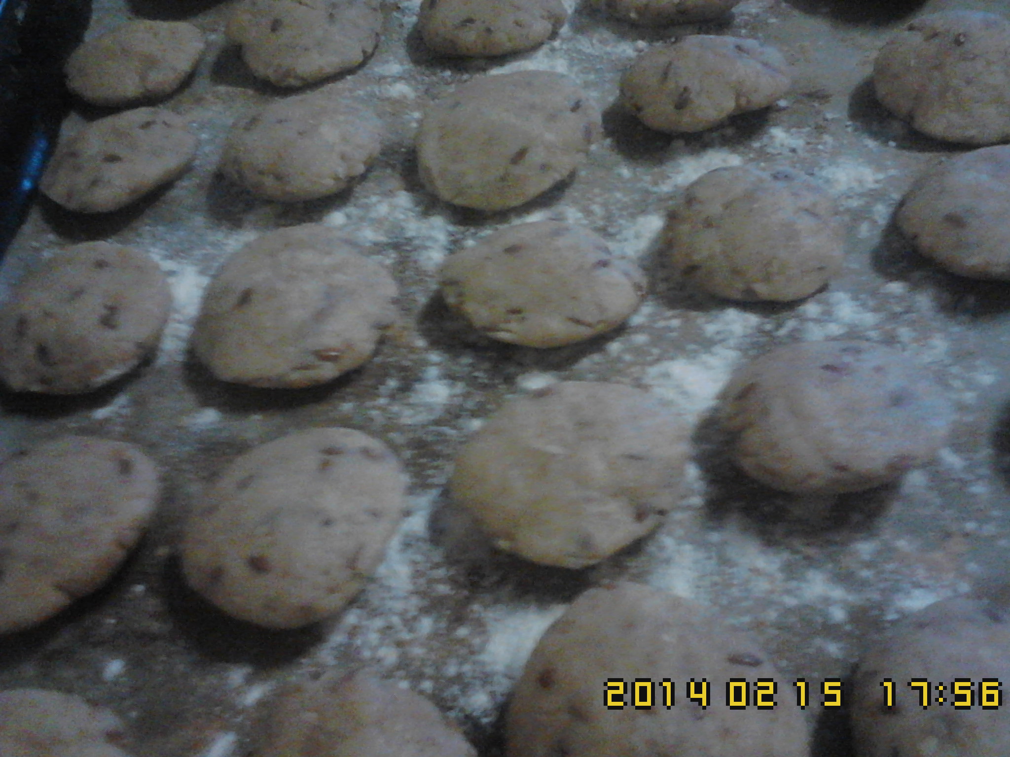 3) Retire a massa do copo,comesse amassar,5m,faça uma bola grande.Retire,pedaços,pequenos,fazendo umas bolas e espalme.Coloque,no tabuleiro,com papel vegetal e farinha.Para os bolos não se pegarem.