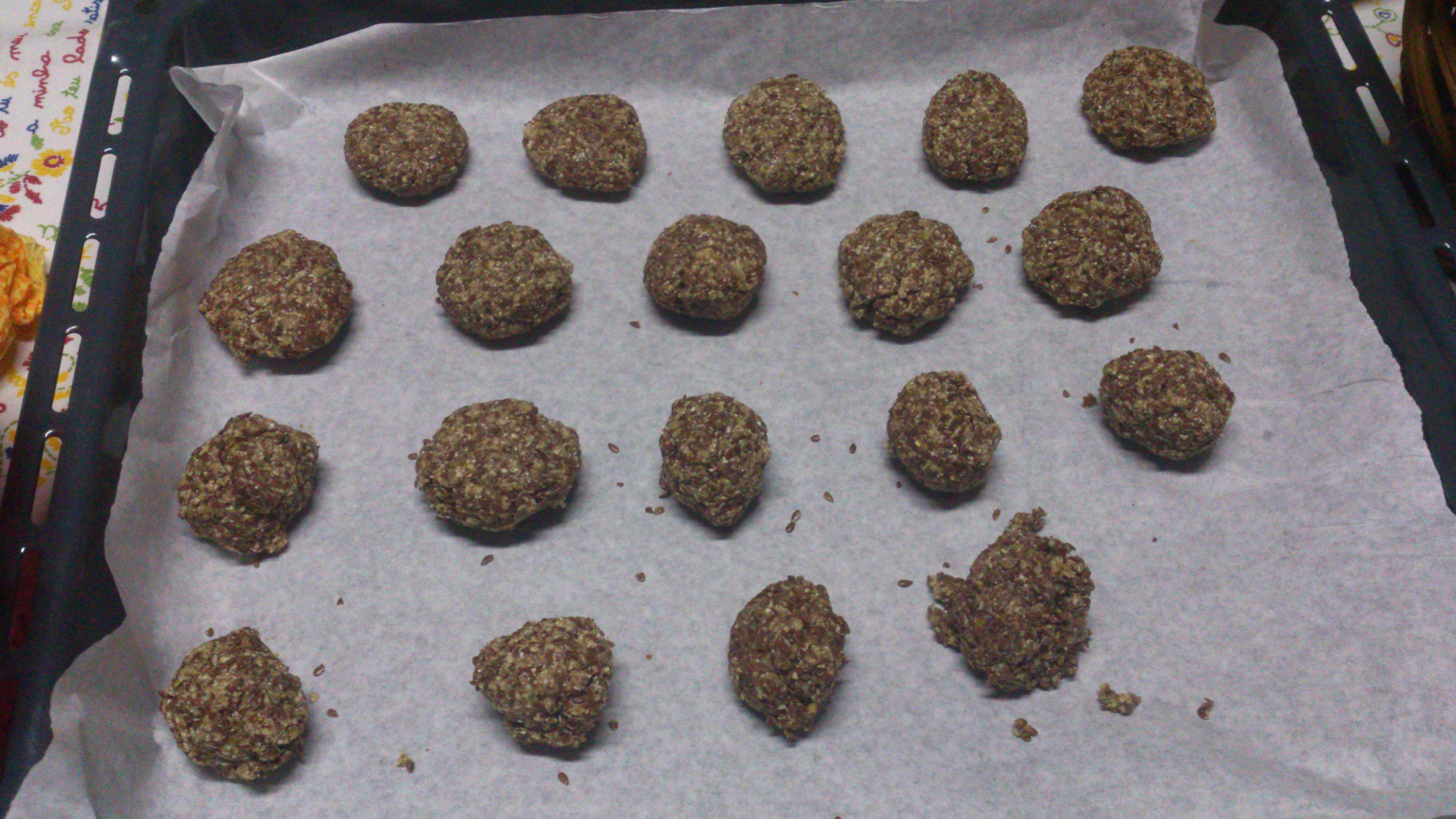 Formar pequenas bolas apertando a massa nas mãos e, num tabuleiro forrado com papel vegetal, levar 15 m ao forno pré-aquecido a 180graus.