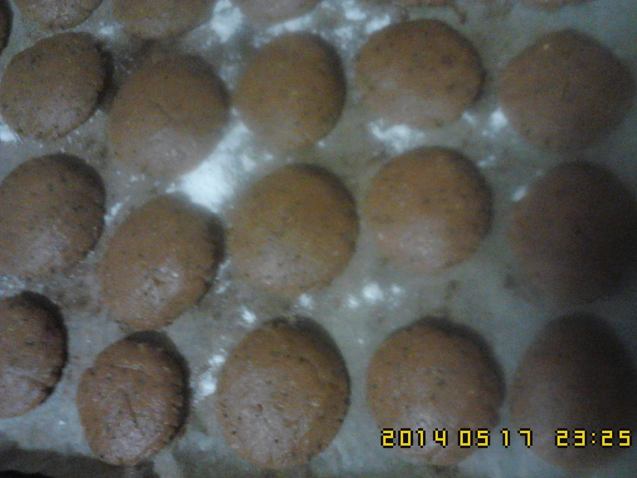 3)Retire do copo,amasse 20s e faça bolas espalmadas.coloque no tabuleiro,com uma folha vegetal.