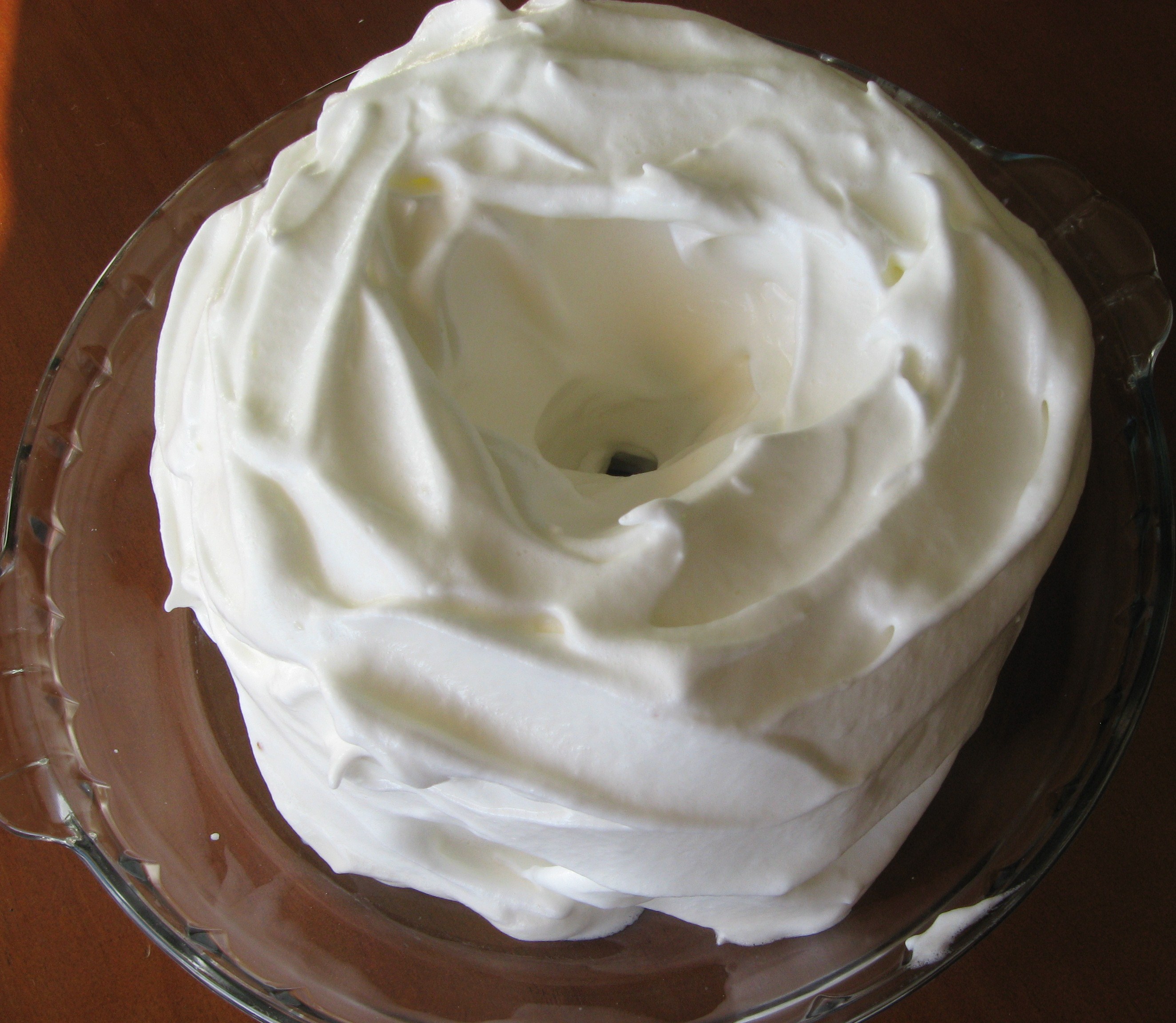 Tirar o bolo do forno, desenformar para um prato e deitar de imediato (ainda quente) o merengue por cima às colheradas