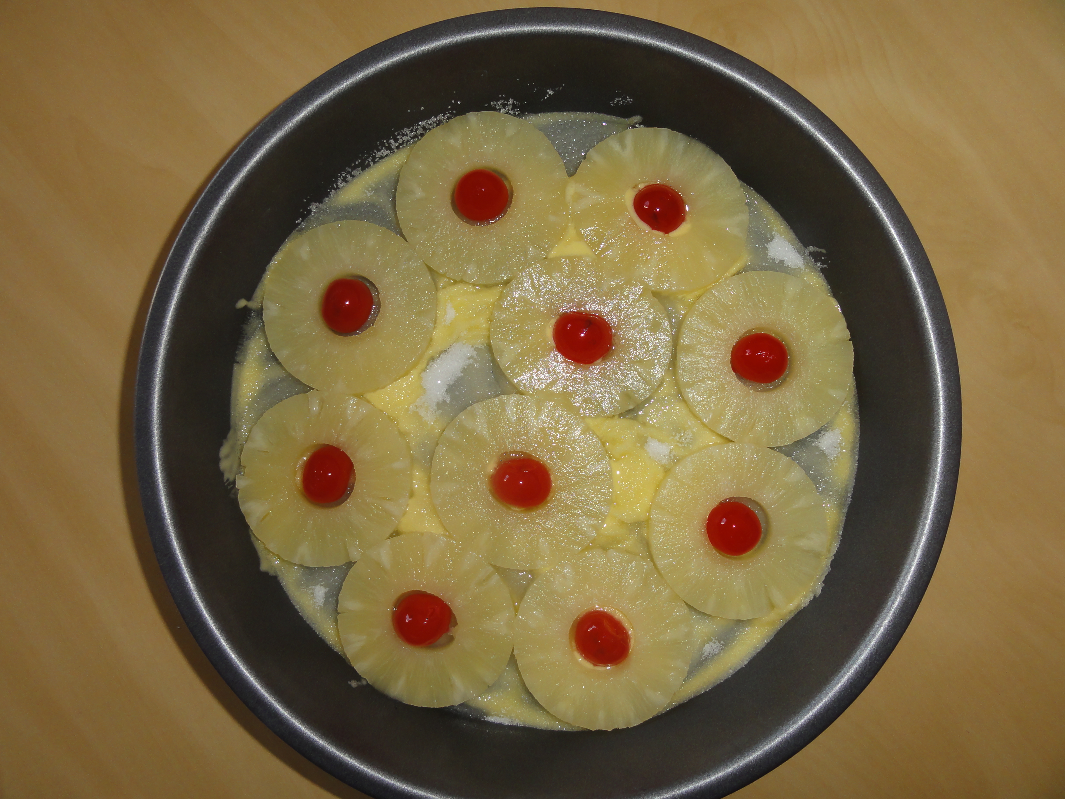Deite dentro da forma 50g de margarina depois 100g de açucar, de maneira que o fundo fique bem barrado, de seguida coloque as rodelas de ananás e as cerejas nos intervalos (ver foto).
