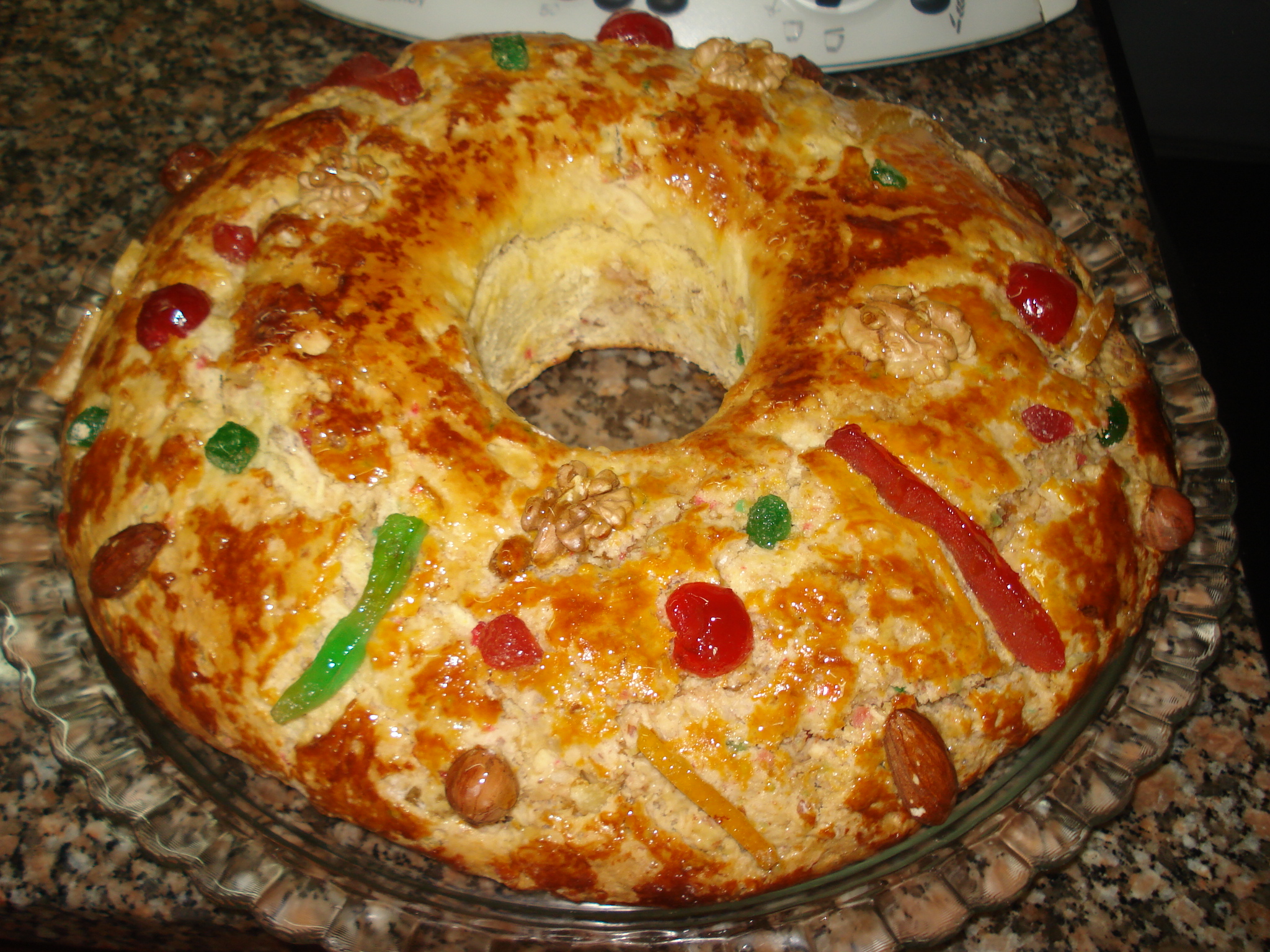 , junte então 250 g de fruta escolhida (cristalizada e seca) através do bocal da tampaRetire a massa do copo. Amasse com as mãos até formar uma bola lisa, polvilhando a mesma com farinh. Dê-lhe a forma de uma rosca e coloque-a num tabuleiro previamente untado com manteiga e polvilhado com farinha