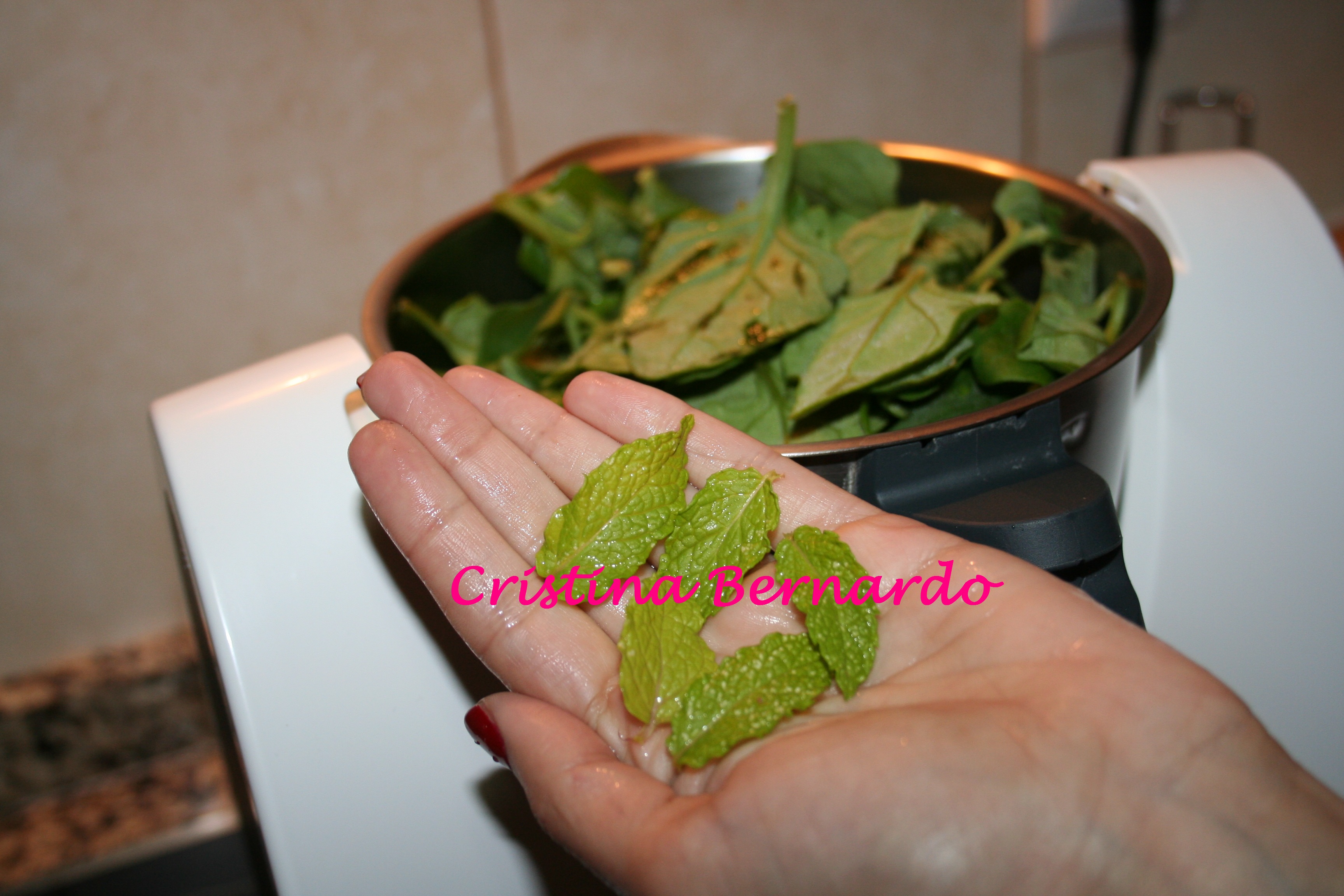 2. Colocar no copo os espinafres e as folhas de hortelã.