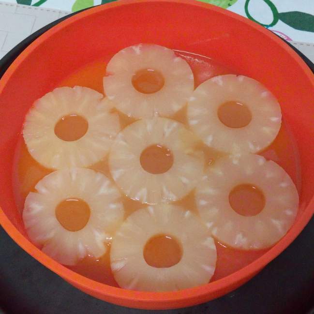 - 7 rodelas de ananás, (usei ananás em calda, lata de 560g)