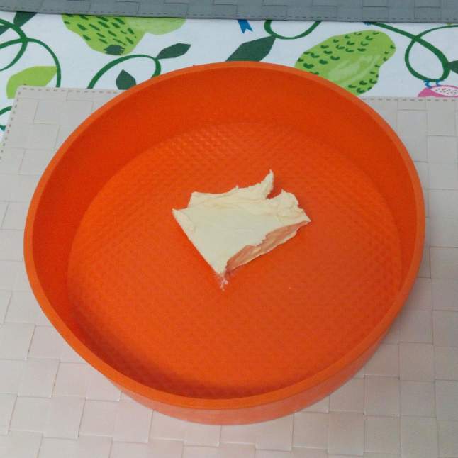 - Colocar as 50g de manteiga na forma (usei forma de silicone) e colocar no forno durante 5 minutos, para que a manteira derreta;