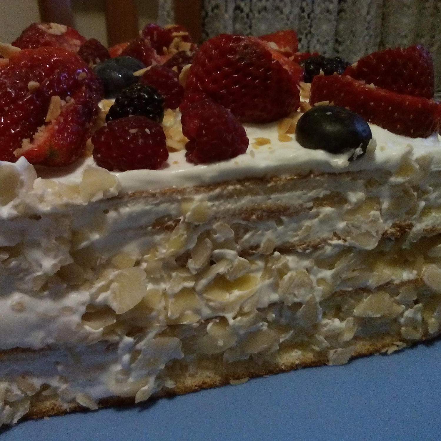 "Tampa fechada" a borboleta de seguida as notas e um pouco do açúcar pulverização e bata na vel.3.5 até estas ficarem consistentes, retire e reserve.depois do bolo frio, dívida a meio, coloque um pouco de natas já batidas a massa folhada novamente natas novamente massa folhada novamente natas e colocar a outra metade do bolo, cobrir o bolo com as restantes notas decorar com frutos vermelhos e os morangos nas laterais colocar as amêndoas laminadas.