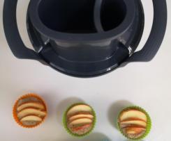- Insira o eixo sobre a lâmina e coloque o recipiente da mandolina Bimby®. Encaixe o disco reversível no eixo com o lado 1 (fatias) virado para cima. Coloque a tampa da mandolina Bimby® e insira 2 maçã reservada, o mais verticalmente possível, na parte larga do bocal. Coloque o empurrador e inicie o modo Fatiar Grosso, enquanto pressiona suavemente o empurrador para baixo. Quando o bocal estiver vazio, pressione o botão para parar. Repita com a maçã restante. Retire a mandolina Bimby® e o eixo.