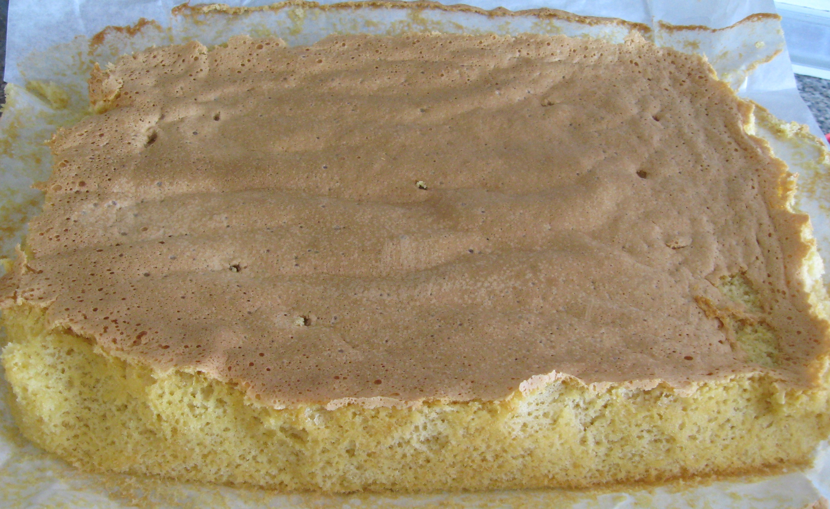 Depois do bolo frio cortar em 2 (verticalmente), retirar o papel vegetal