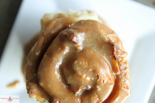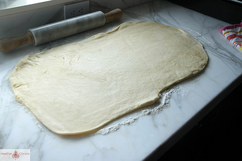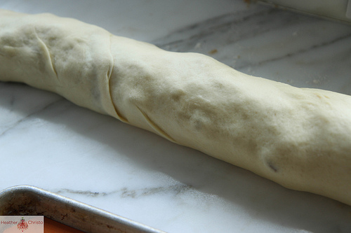 Cuidadosamente, enrole a massa em forma de um rolo grande, começando por um dos lados mais compridos, colocando a extremidade da massa virada para baixo. Sele as pontas com os dedos. Corte em fatias no tamanho que desejar com uma faca de serrilha (eu cortei 12 fatias largas). Transfira as fatias para o tabuleiro reservado e deixe-as repousar enquanto aquece o forno a 180º durante cerca de 15-20 mnt.