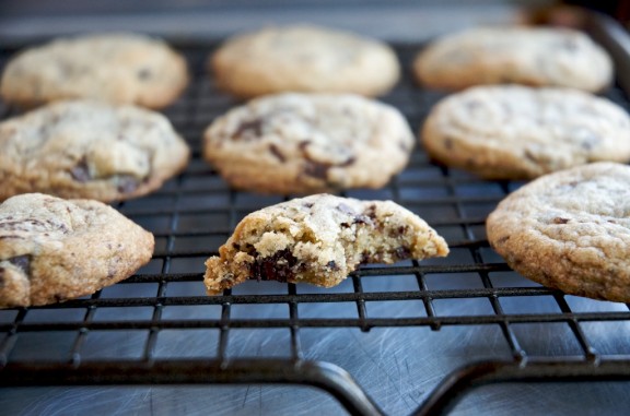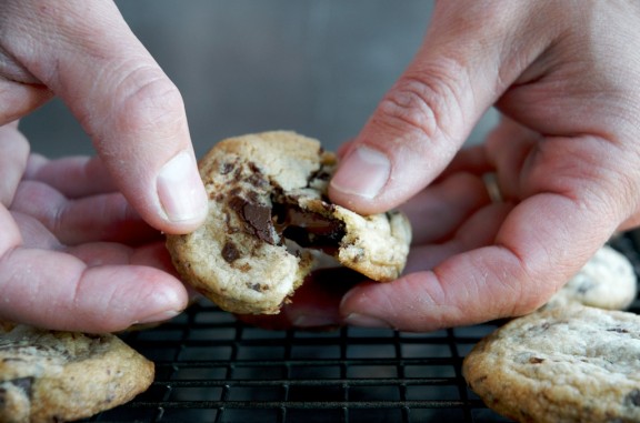 Bata a manteiga e os açúcares 2 mnt/vel 4, até obter um creme liso e sedoso. Adicione os ovos, a baunilha e o sal grosso 1 mnt/vel 4. Junte a farinha e misture 30 seg/vel 4. Por último junte as pepitas e envolva 15 seg/colher inversa/vel 3.