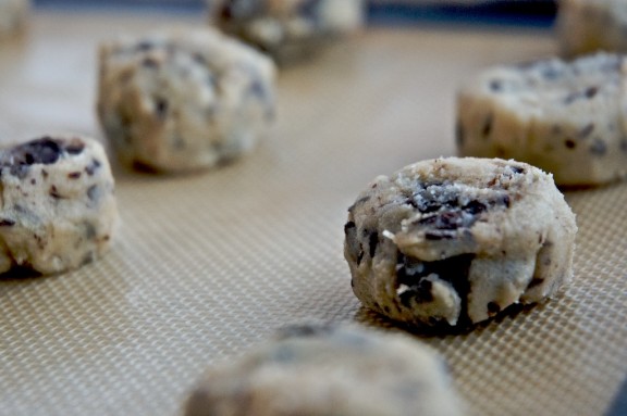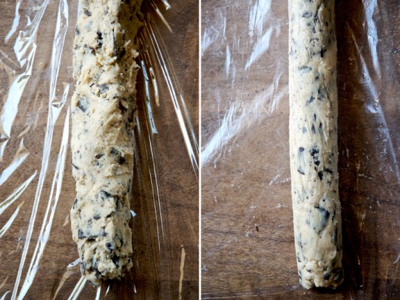 Forme rolos com cerca de 3,5cm de diâmetro. Caso não vá utilizar a totalidade de massa, poderá congelar nesta fase enrolado em película aderente, de outra forma, utilizando uma faca afiada, corte bolachinhas com cerca de 1,5cm de espessura.