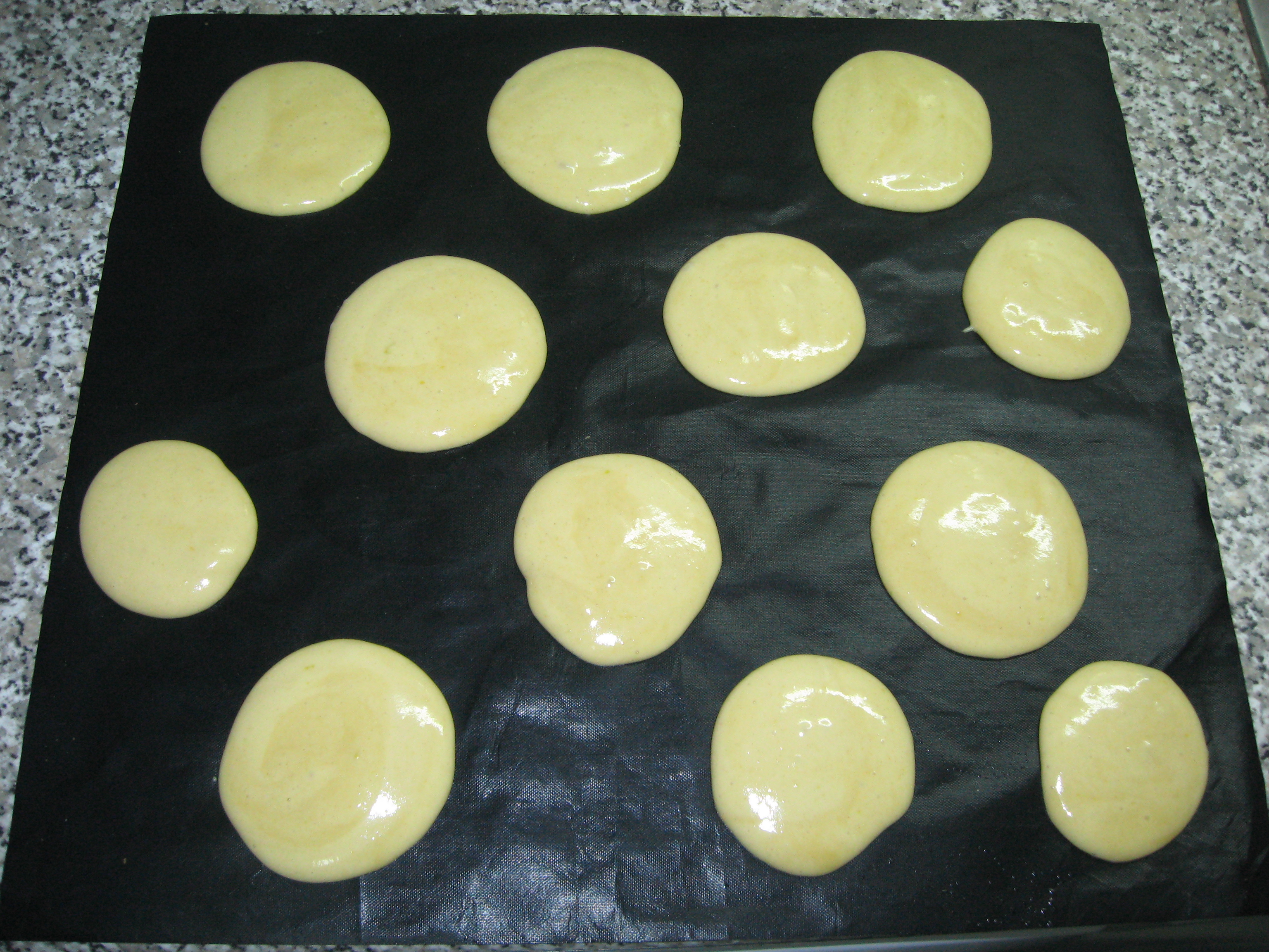 Forrar um tabuleiro com papel vegetal (uso tapete de silicone) e deitar colheradas de massa deixando um espaço entre elas de 3 cm.