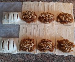 - Transferir os folhados para um tabuleiro de forno forrado com papel vegetal e pincelar com leite ou geleia de marmelo.