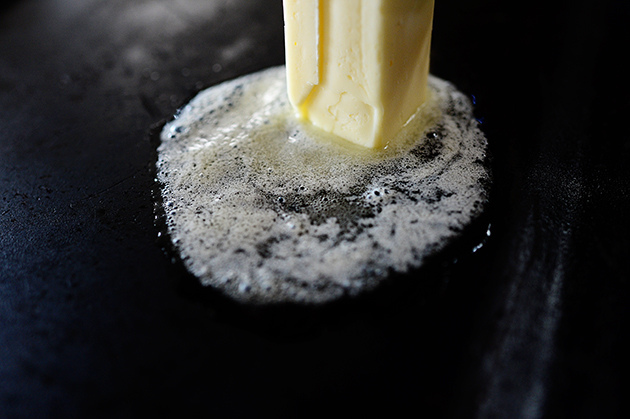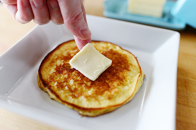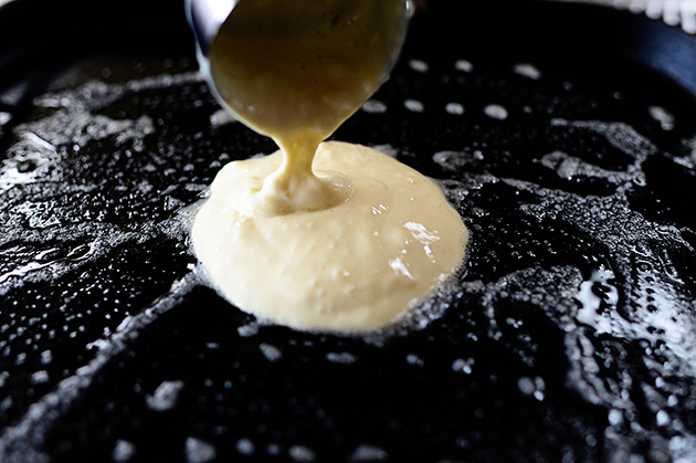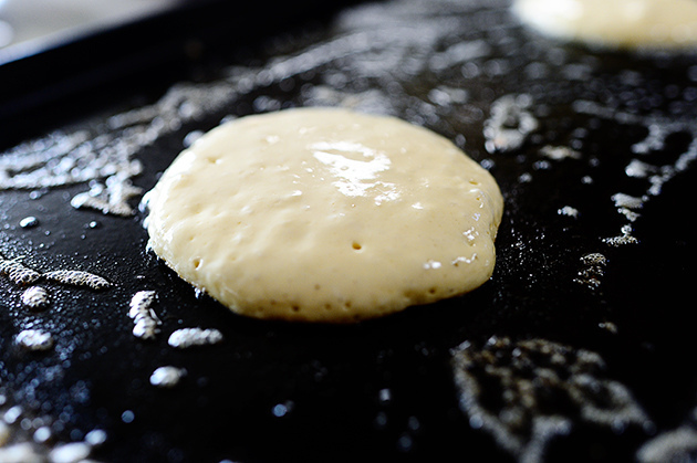 Aqueça uma frigideira anti-aderente em lume médio-baixo e derreta a manteiga. Deite cerca de 1/4 chave. de massa na frigideira. Deixe cozinhar até começar a formar bolinhas na superfície e nos lados da panqueca. Vire-a e deixe cozinhar durante mais ou menos 1 mnt. (É normal que as panquecas fiquem mais moles do que o habitual).