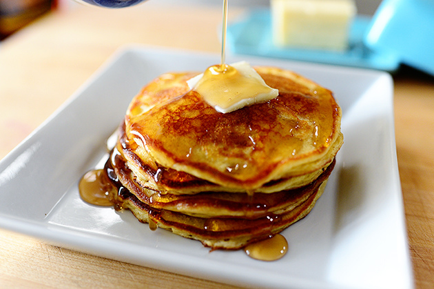 Sirva com manteiga amolecida e cubra com o xarope ligeiramente aquecido.