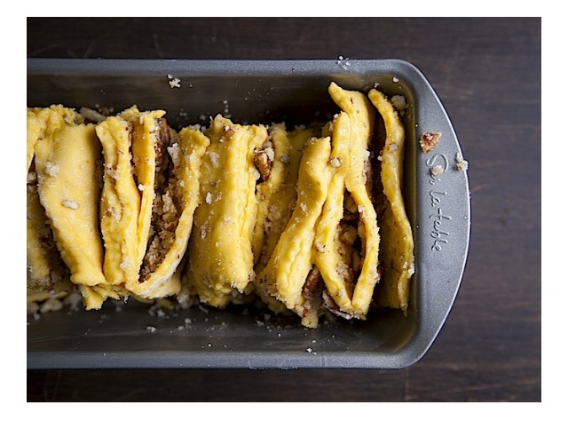 MONTAGEM:Pré-aqueça o forno a 180ºC e e barre uma forma de bolo inglês larga. Reserve. Com movimentos suaves, pressione a massa de forma a retirar-lhe o ar. Numa superfície enfarinhada, usando o rolo da massa, estique-a em forma de um rectângulo de 50x30cm. Usando um pincel de culinária, espalhe as restantes 2 c.sopa de manteiga derretida igualmente. Com uma faca afiada, corte a massa em 5 tiras iguais transversalmente, formando rectângulos mais pequenos. Distribua uniformemente o recheio por cimas das tiras. Coloque as tiras umas por cima das outras, até ter uma pilha de 5 rectângulos. Muito delicadamente, corte a pilha através das camadas, formando 6 pilhas iguais com cerca de 10x5cm.