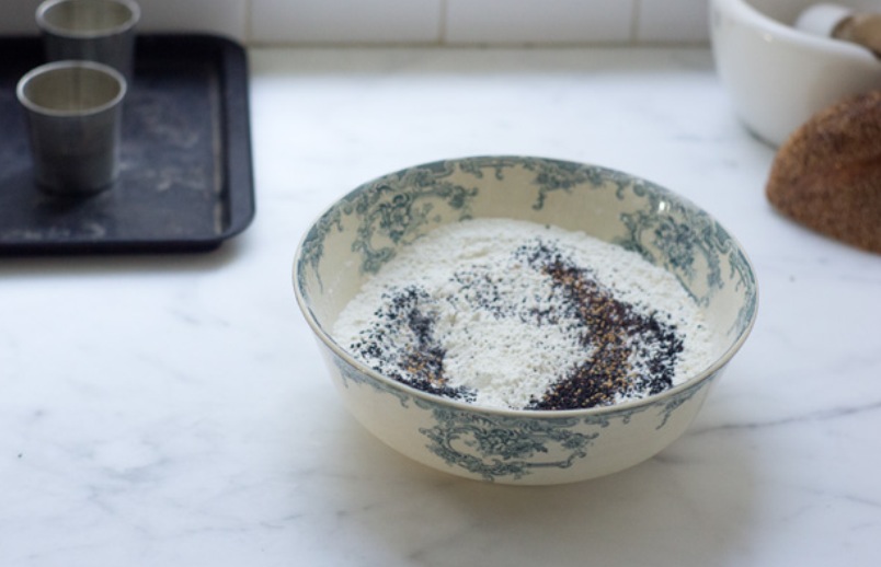 Peneire a farinha, o sal e o fermento 5 seg/vel 5. Junte as sementes e envolva com a espátula. Reserve.