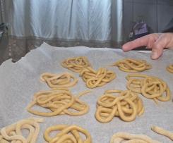 - Depois sobre uma superficie, pegamos em pequenos pedaços de massa e formamos um rolinho o mais fino possivel.