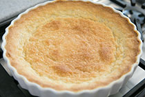 Leve ao forno pré-aquecido cerca de 40 mnts, ou até o topo estar dourado e o recheio firme. Quando retirar a trate do forno o centro deverá oscilar ainda um pouco. Com uma faca afiada, passe em toda a volta dos lados da forma, de maneira a soltar a trate.