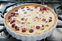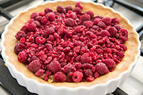 Coloque as nozes picadas por cima da massa cozida e espalhe-as de forma a ocupar o fundo. Coloque as framboesas frescas, ou congeladas, e espalhe-as criando uma camada. Bata os restantes ingredientes do recheio - os ovos, açúcar,farinha,sal e baunilha- 2 mnt/vel 4, até obter um creme liso. Deite a mistura por cima das framboesas e das nozes.