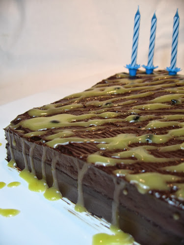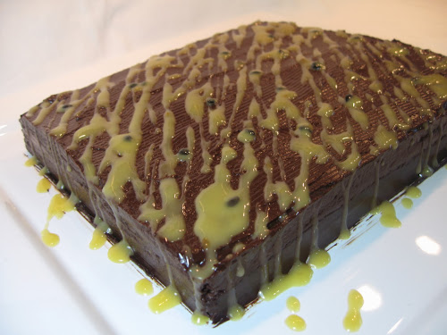 Cubra por cima com o ganache de chocolate e com uma espátula espalhe por cima do bolo e nas laterais. Cubra com o resto do curd de maracujá. Se pretender fazer os efeitos que estão nas fotos, coloque o curd num saco plástico e corte uma das pontas simulando um saco de pasteleiro. Vá apertando e fazendo os desenhos que pretender.