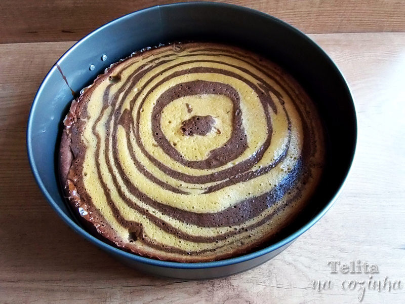 Para obter o efeito zebra, deverá ir colocando uma colher de sopa alternada de massa simples e, por cima, outra colher de sopa de massa com cacau até terminar.