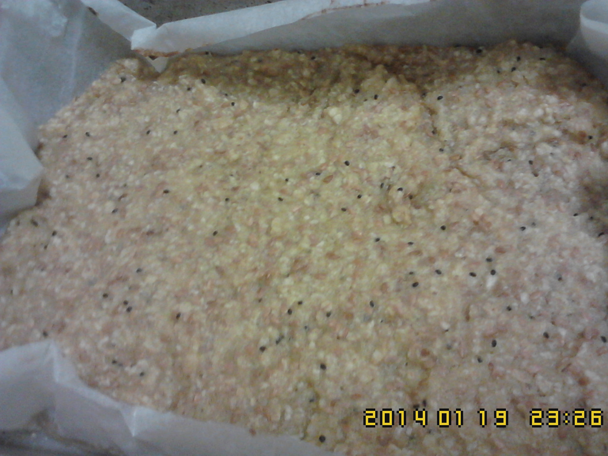 5) Colocar,no tabuleiro,com uma folha vegetal.Forno pré-aquecimento, 200C-15 a 20m.Depois,deixe arrefecer.Pode,fazer pequenas barras,enrroladas em papel de aluminio, pode levar para o trabalho,escola,etc.Bom apetite.