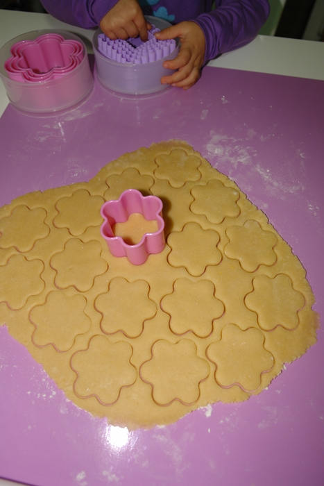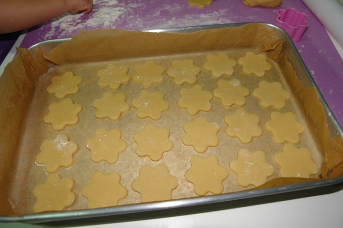 Estenda a massa com a ajuda do rolo e com os cortadores que preferir molde as bolachinhas. Coloque as bolachas num tabuleiro untado e forrado com papel e leve ao forno pré-aquecido a 200º durante cerca de 8 minutos.Nota: pode aromatizar as bolachas com limão, laranja, canela, etc.