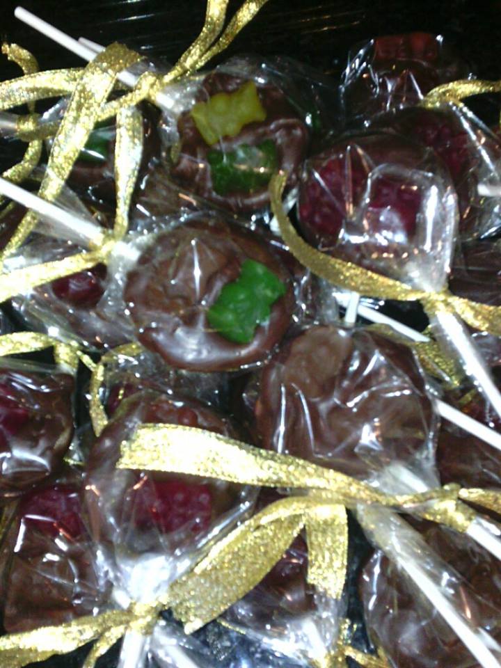 - Coloque na bancada uma folha grande de papel vegetal, coloque os palitos de plástico e deite colheres cheias de chocolate derretido em cima dos palitos, coloque logo de seguida as gosmas para agarrar