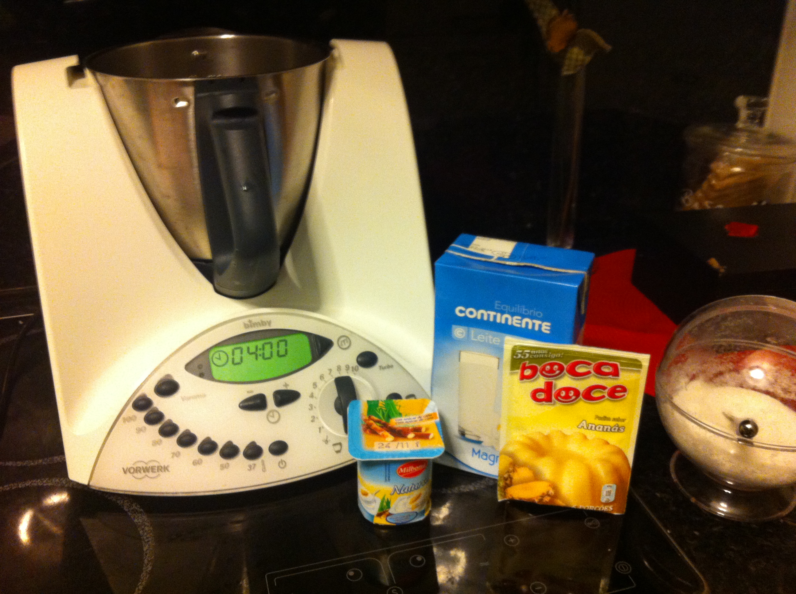 3. Junte o restante leite, o açucar, o iogurte, e a gelatina/pudim e programe 4min/50ºC/vel4.