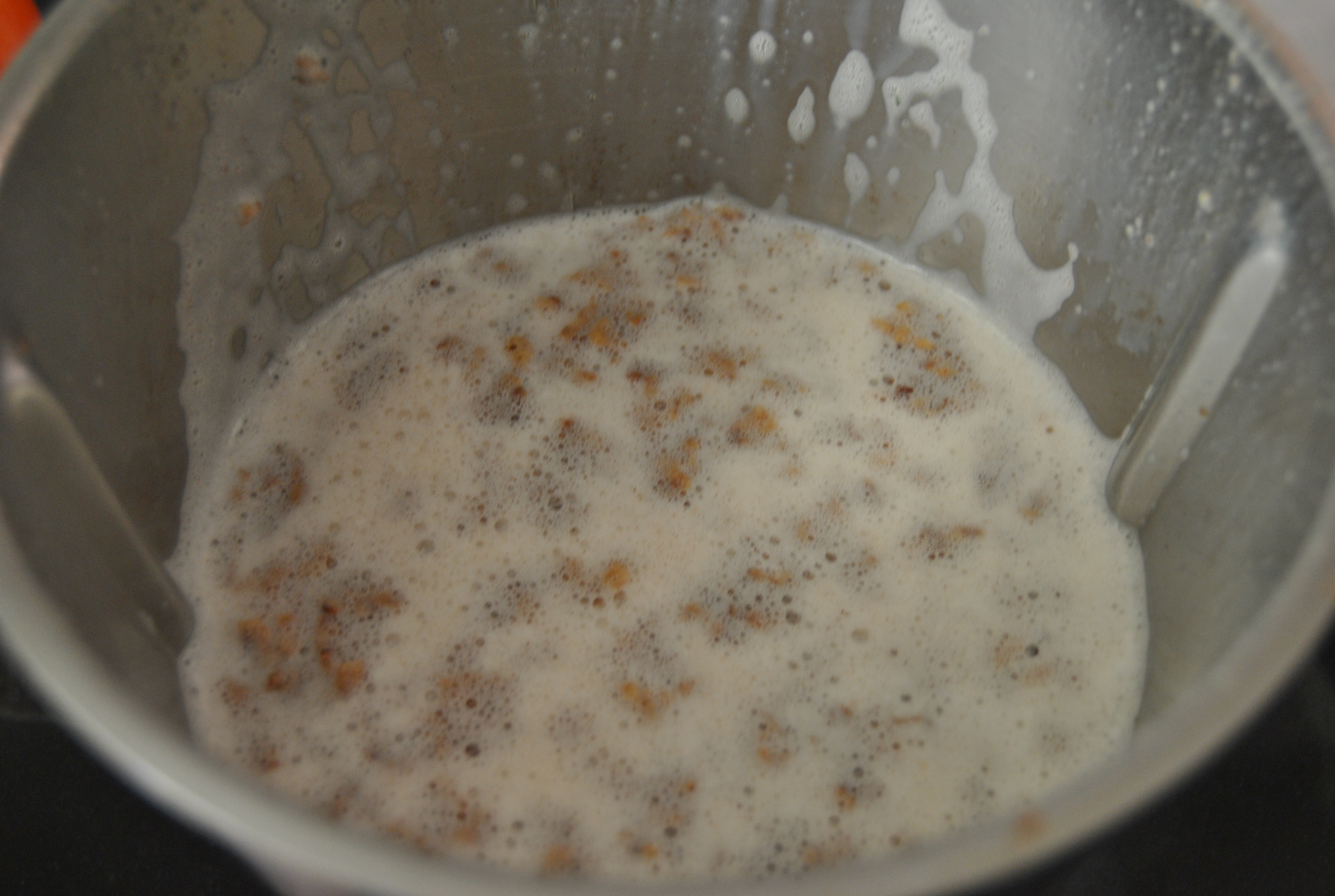 Deitar no copo o leite com o açúcar, o leite em pó, canela e as sementes de linhaça durante 5m, temperatura 50, velocidade 4.