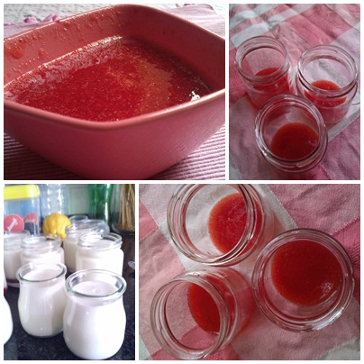 Eu como tenho iogurteira, terminado o tempo coloco, o coulis de morango  no fundo dos copos acrescento com cuidado o iogurte e levo á iogurteira cerca de 8 horas.