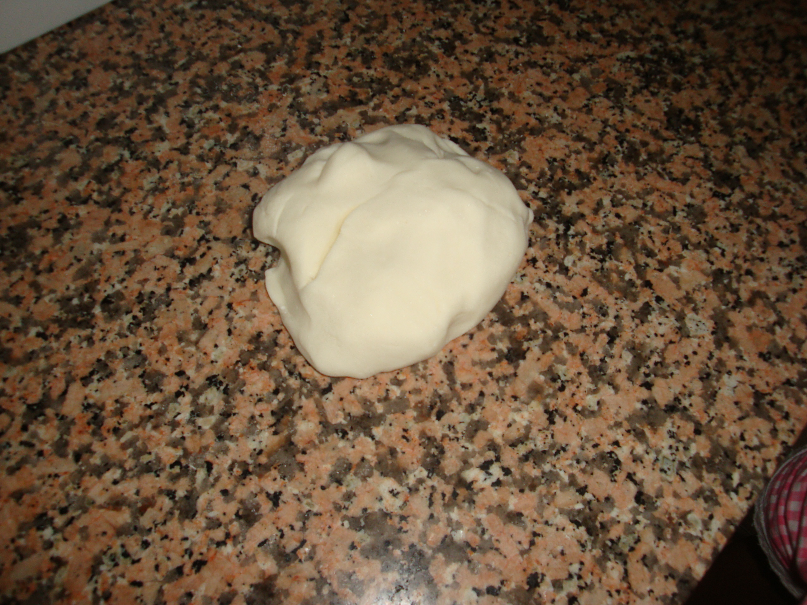 Ao fim deste tempo vai obter uma massa branca e maleável. Coloque-a numa bancada de cozinha e forme uma bola grande.