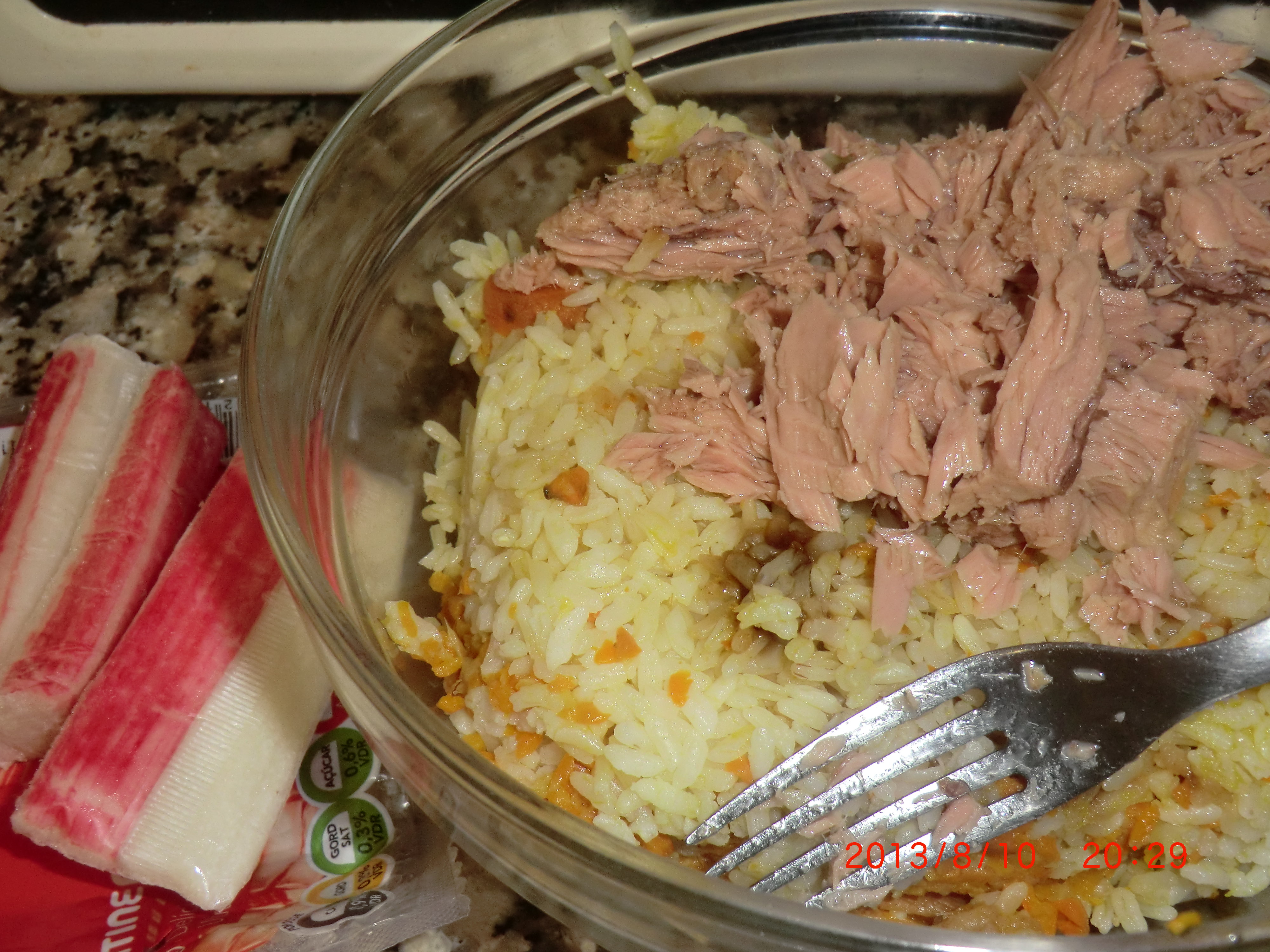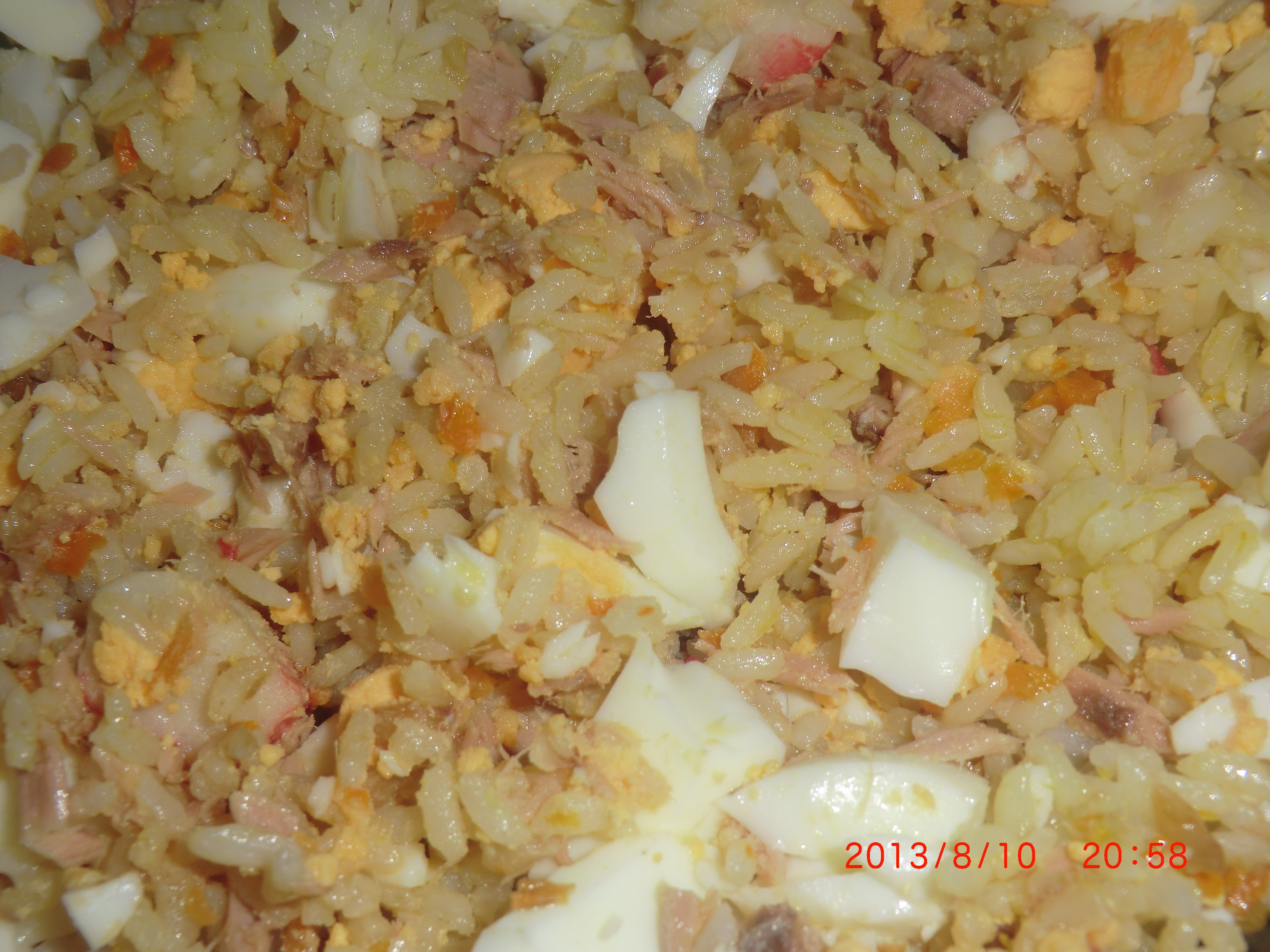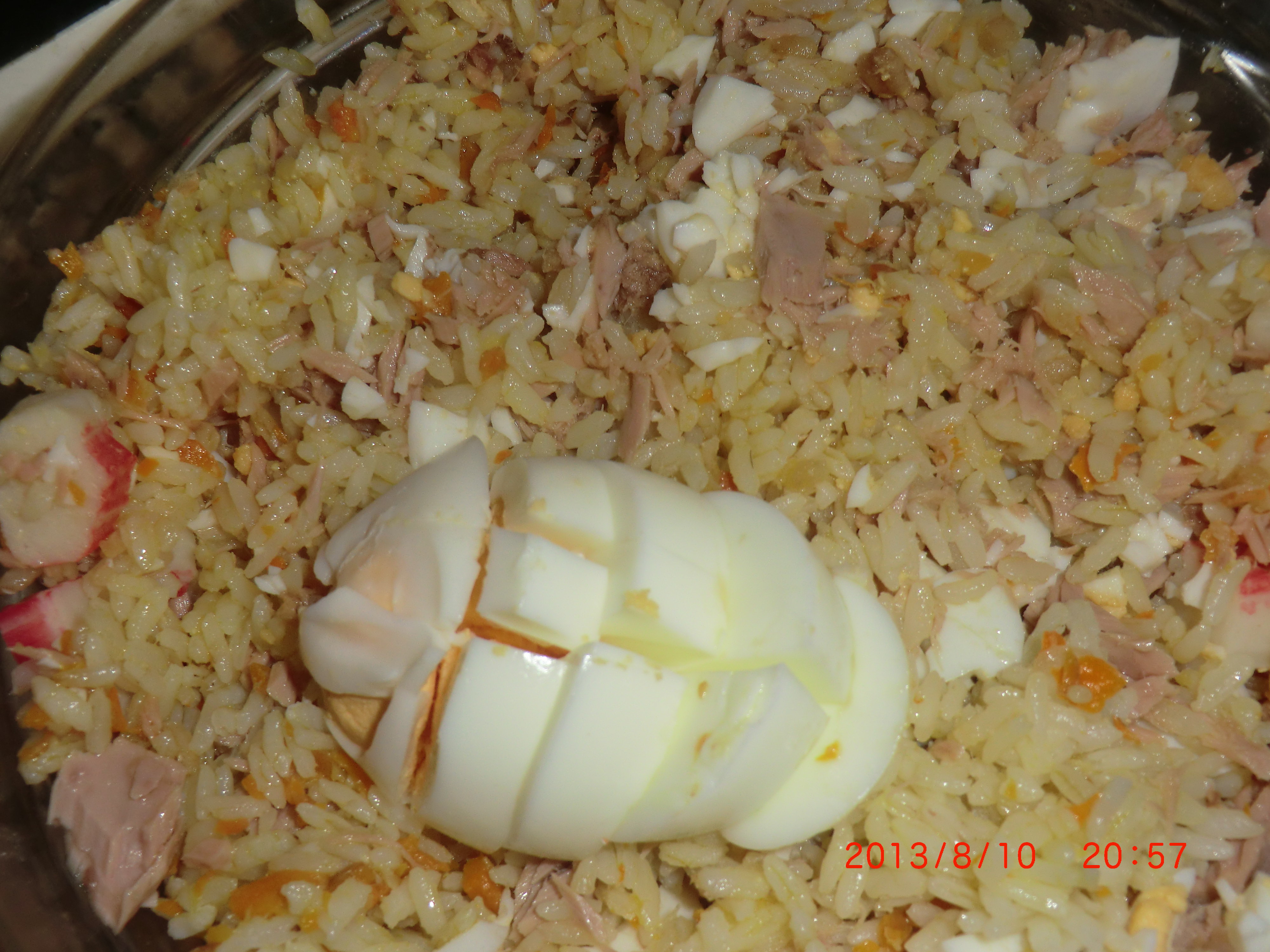 Fazer, arroz de cenoura da bimby.Retire,ponha numa travessa.Coza os três ovos.Com um litro e meio de água,ponha os ovos no cesto,tape.V2-15m-100graus.Depois cozidos,descasque os ovos,corte aos bucados,pequenos,misture com o arroz,delicias do mar cortadas,latas de atum.Pode aproveitar o oleo ou o azeite do atum,só um pedaço e misture no arroz.Sirva-se com um pedaço de maionese, á parte ou misture com o arroz e os acompanhamentos.Bom apetite.