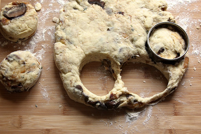Junte a mistura de farinha reservada e a margarina e misture cerca de 15 seg/vel 4, deverá ficar com uma massa semelhante a migalhas. Junte o ovo e o buttermilk, mexa com um garfo, e junte á farinha 1 mnt/vel 3. Por último adicione a mistura dos cogumelos e envolva 15 seg/