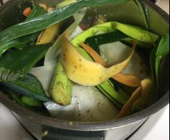 - 500 g cascas e restos de legumes, (pode ser: alho-francês, cebola, alho, cenoura, abóbora, chuchu, aipo, etc.