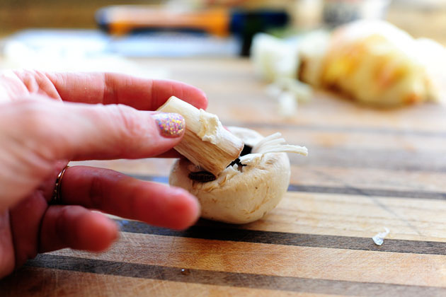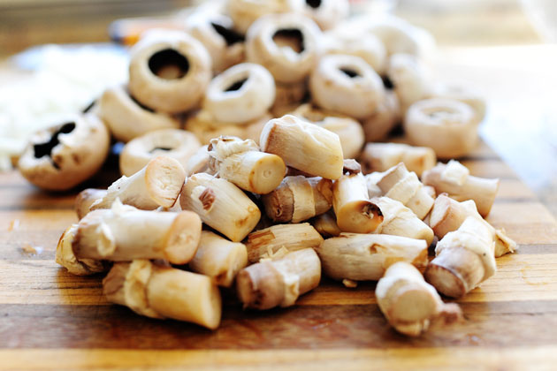 Lave e seque os cogumelos. Retire os talos e pique juntamente com a cebola 5 seg/vel 5.