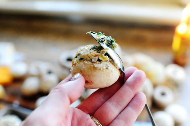 Com a ajuda de uma colher, recheie os cogumelos com a mistura e arredonde-a no topo com a colher. Coloque-os num tabuleiro forrado com papel vegetal e leve ao forno pré-aquecido durante 20-25 mnt, ou até os cogumelos estarem cozinhados e o recheio bem quente. Sirva-os em seguida á temperatura ambiente.