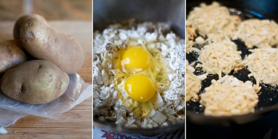 Prepare um recipiente forrado com algumas folhas de papel absorvente. Usando mais umas quantas folhas, esprema as batatas descascadas retirando o máximo de água que conseguir. Quando as batatas estiverem secas, rale-as com um descascador de legumes para o recipiente.