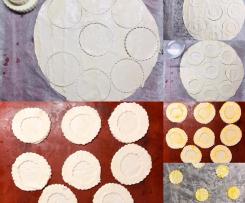 1.2. Estender o rolo de massa folhada numa superfície lisa e cortar a mesma com um corta massa de dupla face em toda a massa folhada. Com um corta massa mais pequeno cortar ao centro de cada base já cortada. Repetir o mesmo para o outro rolo de massa folhada.