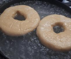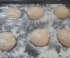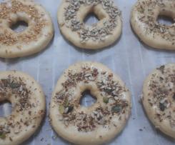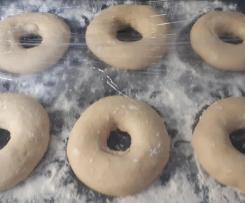 - Divida a massa em 6 bolas e coloque-as sobre um tabuleiro enfarinhado. Tape com película aderente pincelada com óleo para que não se agarre aos bagels e deixe descansar por cerca de 1 hora. Ao fim desse tempo, perfure-os a meio com o dedo e dê-lhes o formato do bagel. Tape novamente com a película aderente untada e deixe repousar até que dobre de volume.